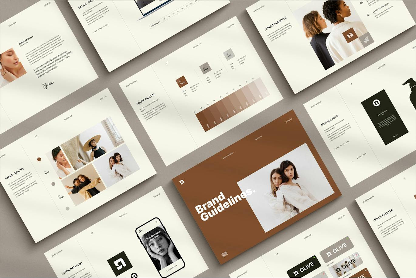 打印或导出并以 pdf 格式发送给客户。轻松用您自己的字体和品牌颜色替换。该模板有 6 个部分,功能齐全。部分包括:品牌战略、标志、颜色、版式、图像、文具、社交媒体和定义。该模板中的大部分副本都是真实可用的副本。