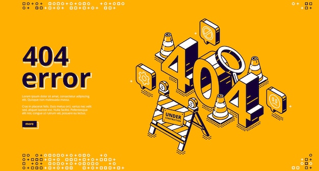 404错误等距着陆Banner,网站维护,页面未找到概念,交通锥和标志正在建设中。