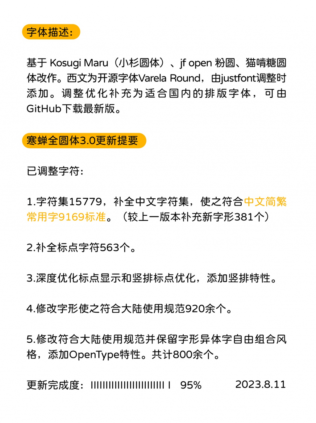 寒蝉团圆圆是基于日本开源字型小杉圆体(Kosugi Maru)justfont粉圆进行调整的圆体字型,采用SIL Open Font License 1.1授权发表。