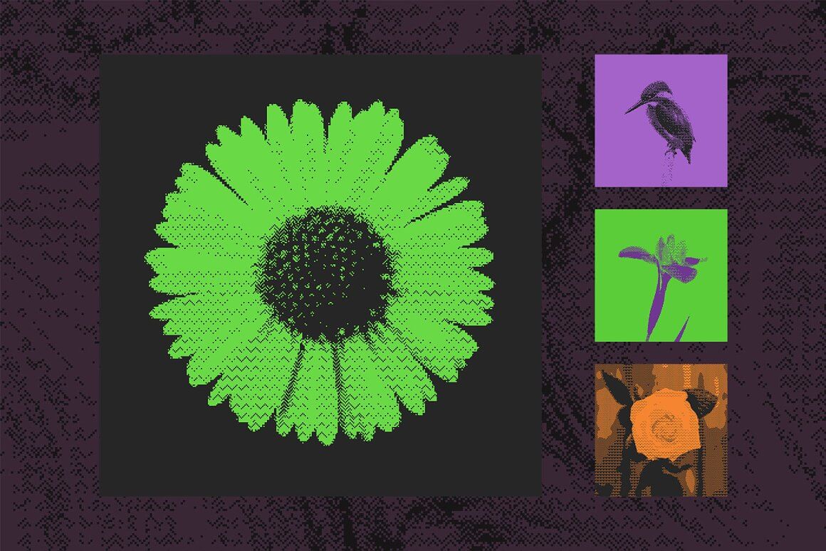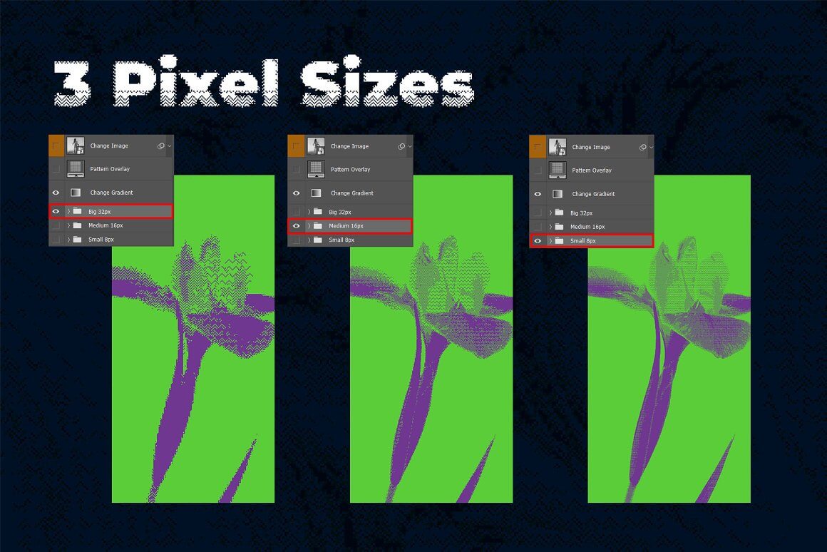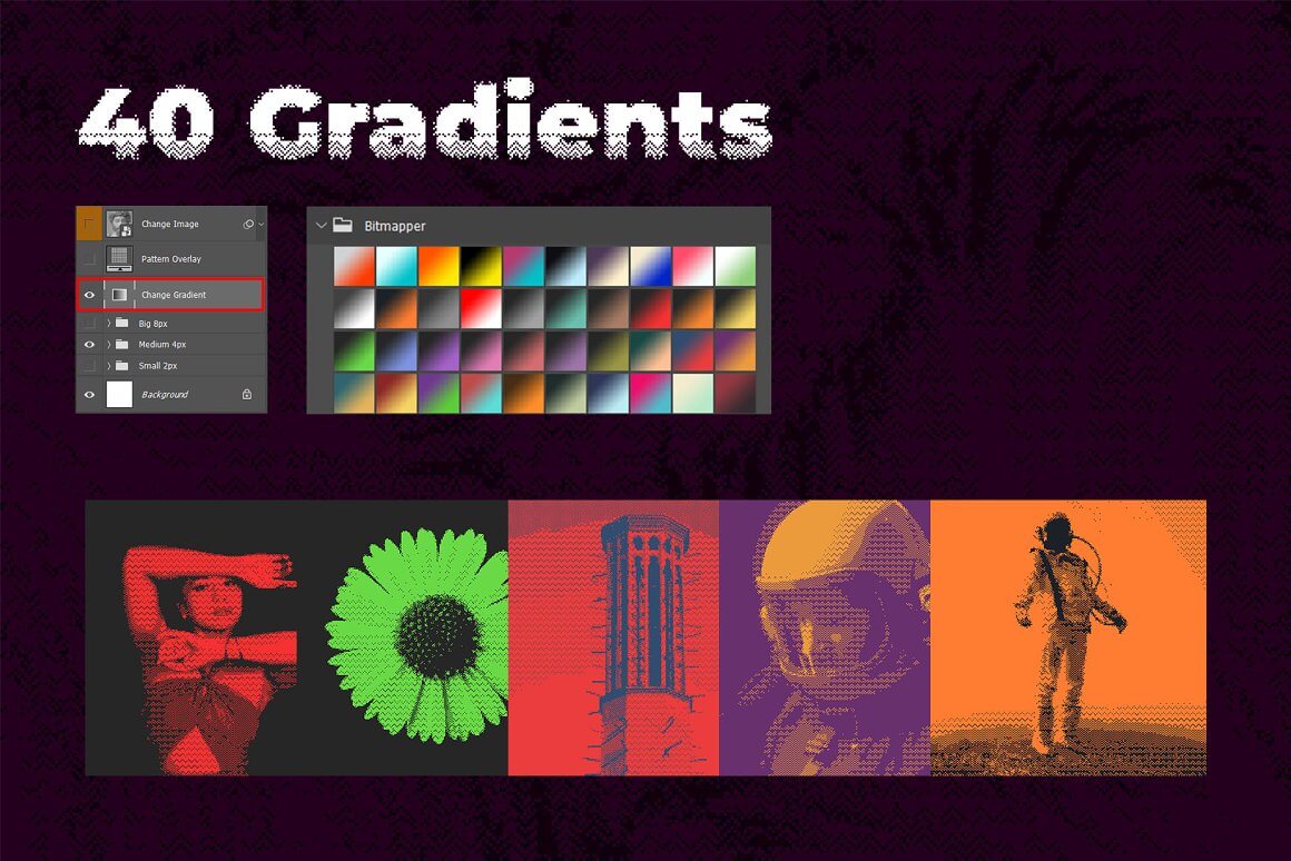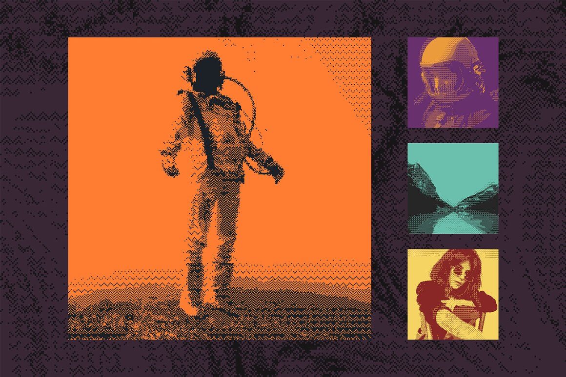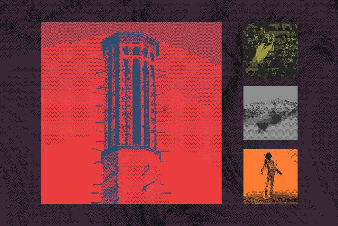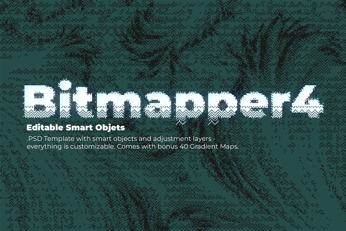 与其他类似产品不同,这不是一个动作包,它是一个带有可编辑和可调整图层的真实 Photoshop 模板。它不只是将您的图像从灰度转换为位图,它还会在智能对象上创建位图效果。您可以自由地尝试颜色、光线、尺寸,以获得您想要的效果并控制整个过程。