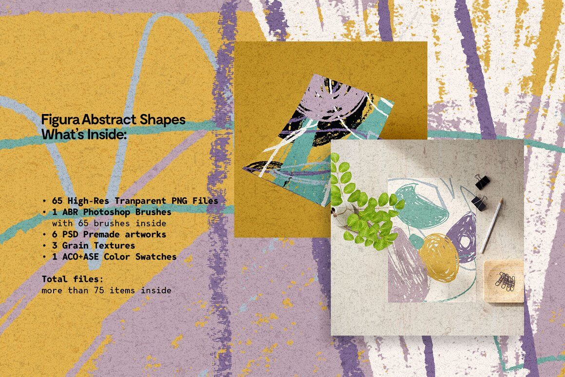 灵感来自抽象绘画中的元素之美、简单的形状、画中每一笔笔触的粗糙度。由墨水、画笔和蜡笔制成的真实抽象形状创建。每个形状都扫描成数字版本并精心制作,以获得形状本身的最大形状和细节。