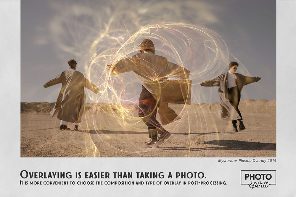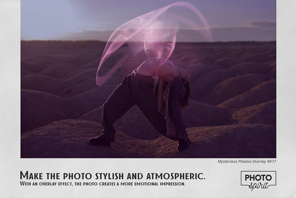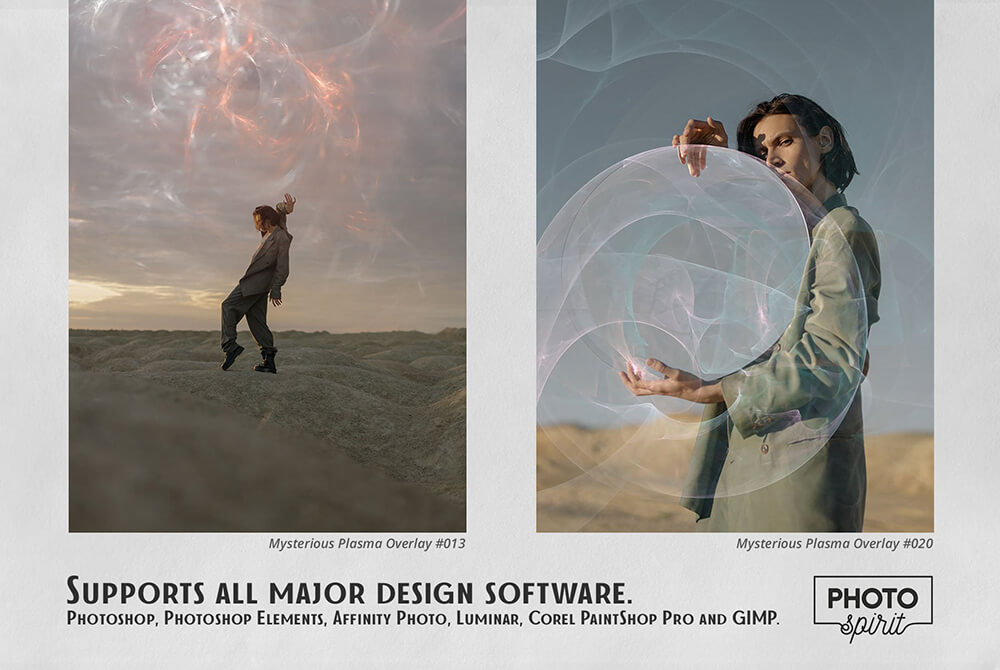 适合业余爱好者和专业人士。在彩色和黑白照片上表现出色。为了您的方便,在屏幕模式中添加了用于选择和覆盖叠加层的操作。这适用于 Photoshop 和 Photoshop Elements。Mysterious Plasma Overlays 可以在任何图形编辑器中使用,它支持屏幕模式下的图层叠加。
