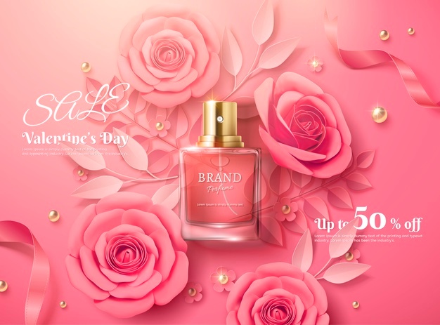 粉色玫瑰香水产品情人节销售活动矢量模板,矢量设计,可用于情人节活动产品促销项目。