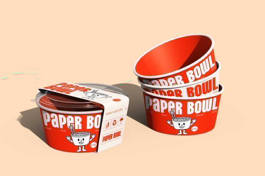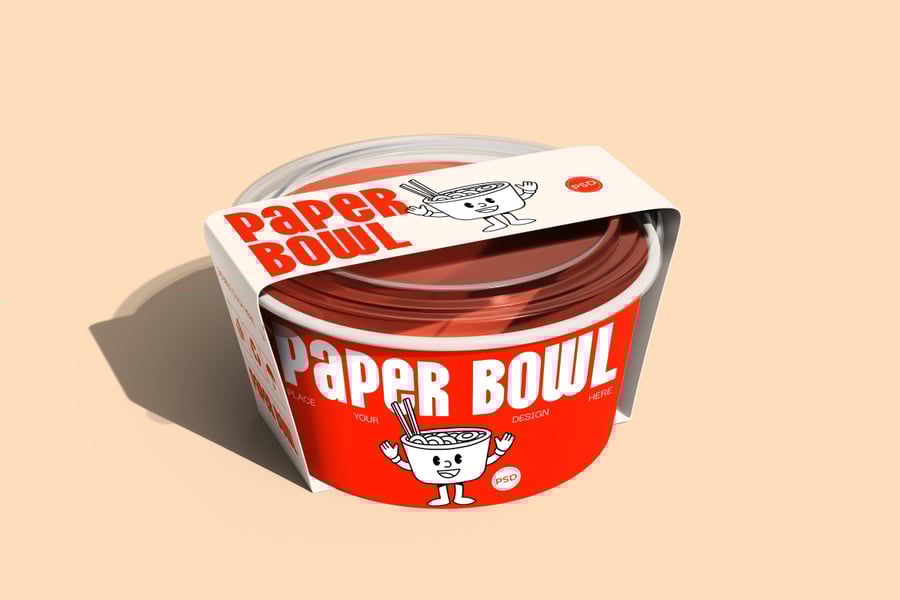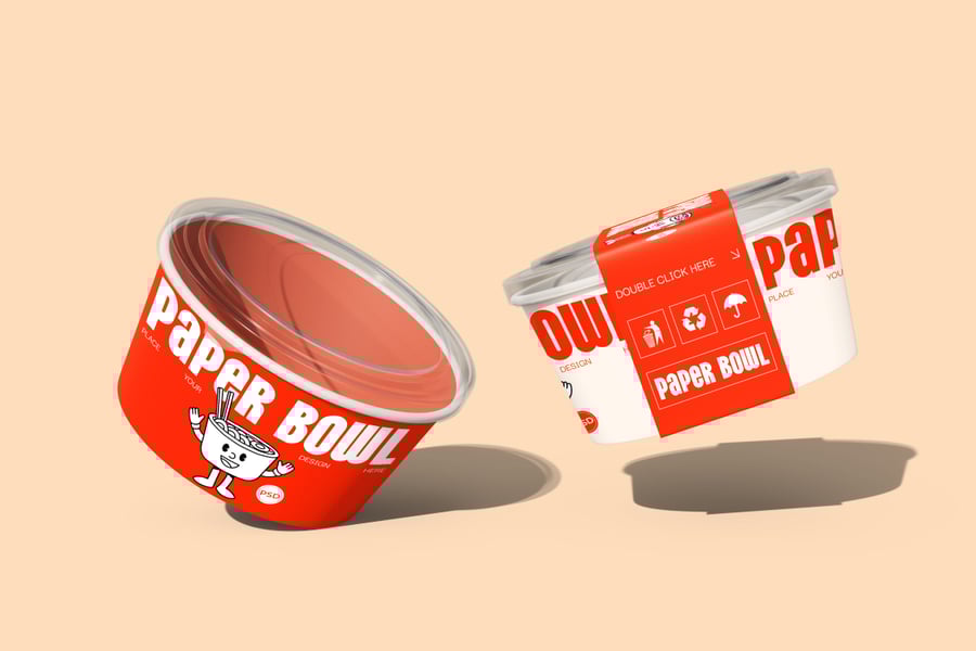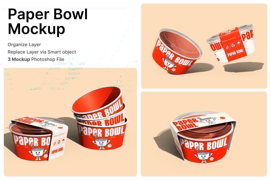 使用这款专业的纸碗模型来展示您的食品包装设计。该模型包含三个高分辨率 Photoshop 场景,分别采用堆叠、浮动和俯视图,非常适合展示面条、沙拉、米饭、汤或外卖食品的品牌形象。借助可自定义的纸张表面、逼真的阴影和智能对象图层,您可以轻松插入您的作品,获得精美逼真的效果。非常适合餐厅、快餐连锁店、外卖品牌和食品包装作品集。