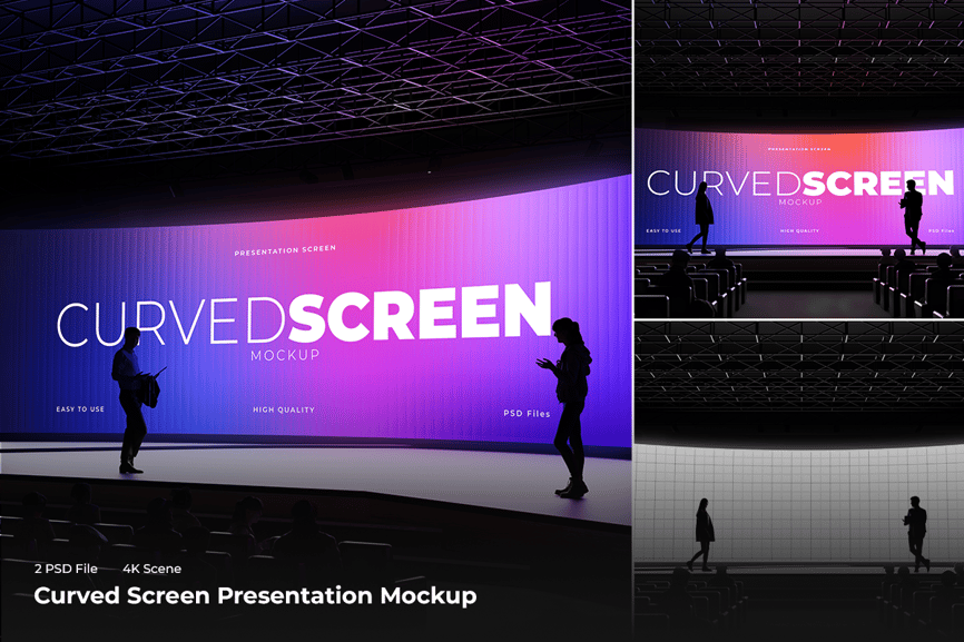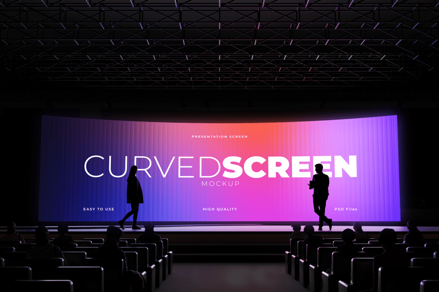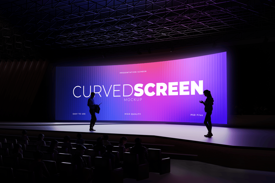 这款演示样机以逼真的礼堂场景为背景,以时尚的弧形屏幕为特色,助您实现创意。为了打造最佳视觉效果,这款样机在现代舞台环境中,结合专业灯光和观众视角,展示您的幻灯片、品牌形象或创意视觉效果。它非常适合商业推介、主题演讲或创意展示,让您自信而时尚地展示您的作品。