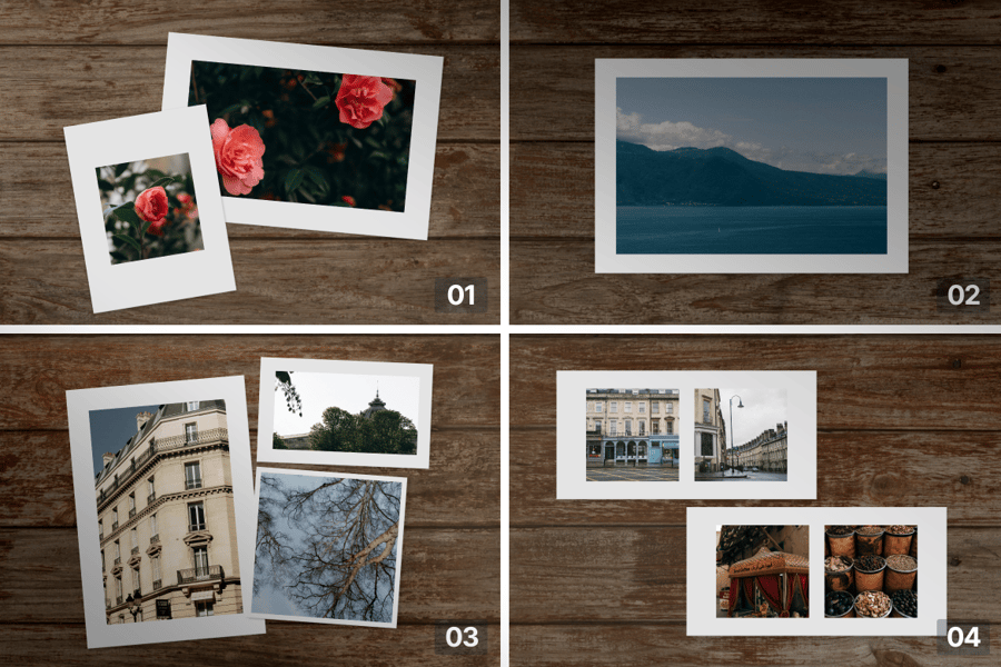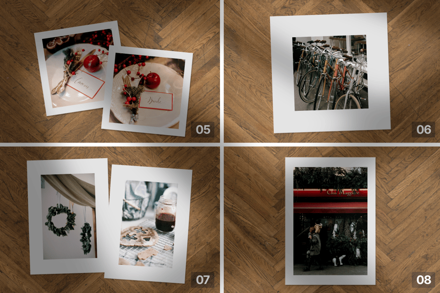 这套 PSD 模型包含十张高质量的纸质照片设计,背景均为真实的木地板。该模型展现了温馨宜人的生活场景,从闪耀的烛光到优雅的茶室,并辅以逼真的纸张纹理、自然的阴影和细致的木纹。