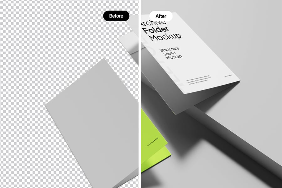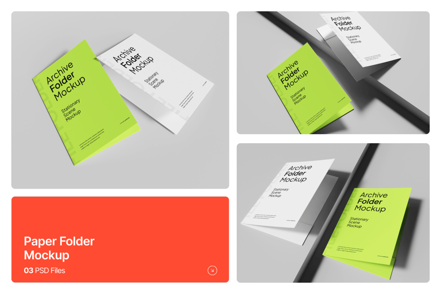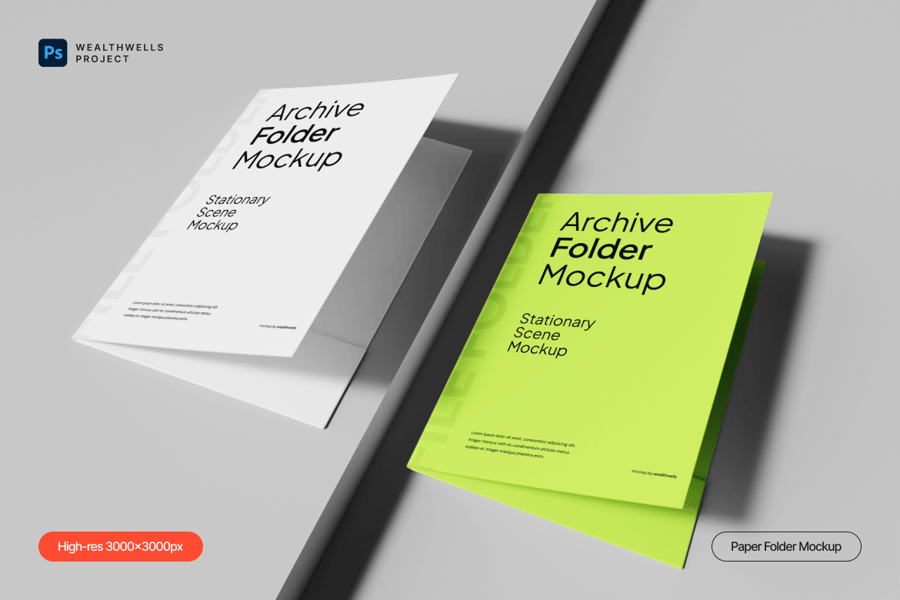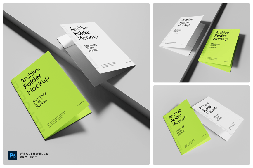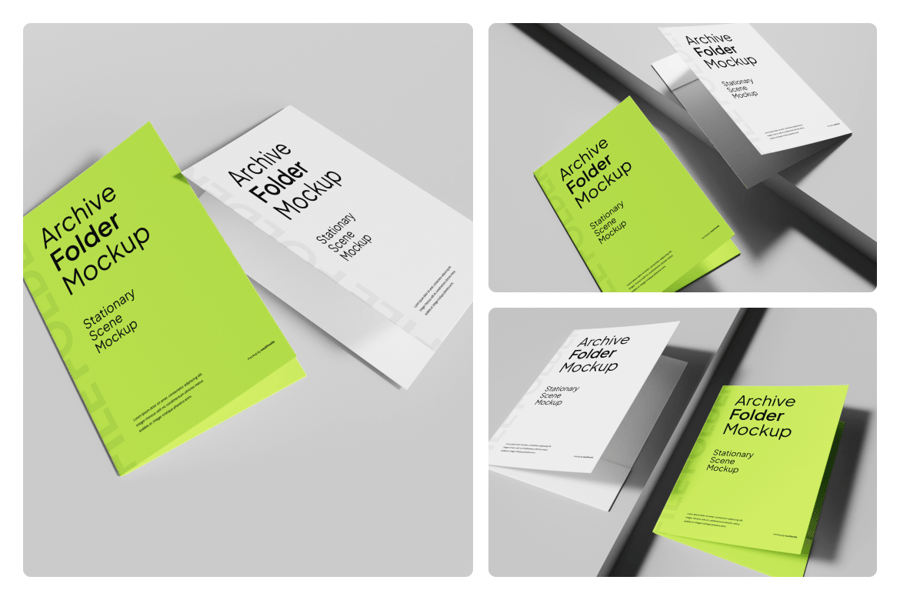 该档案文件夹模型集采用现代简约文具设计,配有光滑的白色和霓虹绿色封面,与干净的背景隔离,适合专业品牌展示。