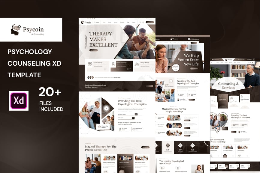 Psycoin 心理咨询 xd 模板。这是一款专为心理咨询公司服务设计的精美艺术板模板。它适用于所有心理咨询网站、心理专家、健康咨询、心理护理、心理护理、心理学家、医生诊所网站以及更多心理机构公司。Sycols 采用现代 UI/UX 和 xd 制作的独特设计。