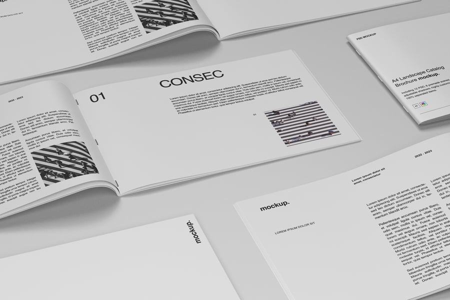 该套件包括 12 个 PSD A4 目录景观模型、6 个预制场景、高质量 3000×2000 300dpi 设计,各个方面都高度可定制。