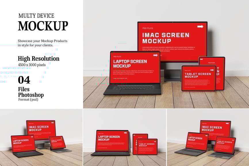 秀出您的多设备设计风格!只需几秒钟,即可为您的客户创建逼真的多设备模型。此 PSD 文件使用智能对象功能,让您轻松快速地更改模型内容。非常简单!只需双击智能对象,粘贴您的作品,保存即可完成。