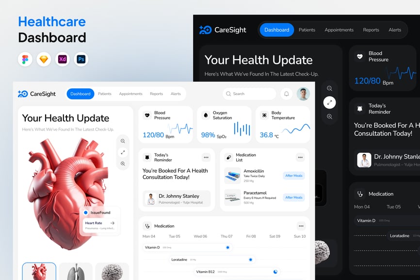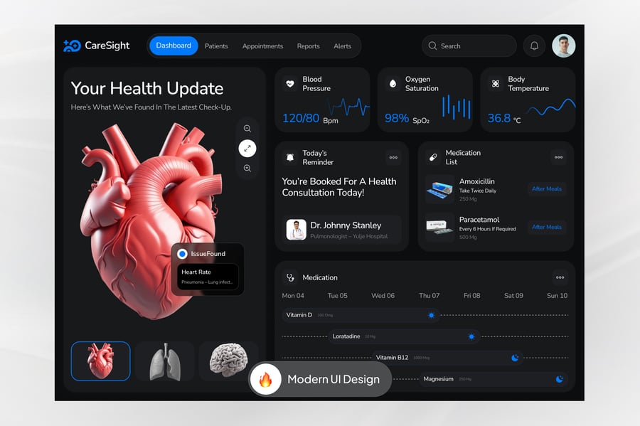 医疗仪表板让患者和护理人员能够一目了然地追踪重要的健康信息。从用药提醒和预约安排,到实验室结果和健康目标,该仪表板如同您的个人健康助理,让一切井然有序。清晰的视觉效果和实时更新,让患者能够随时了解自身病情,监测康复进度,并更积极地参与治疗计划。