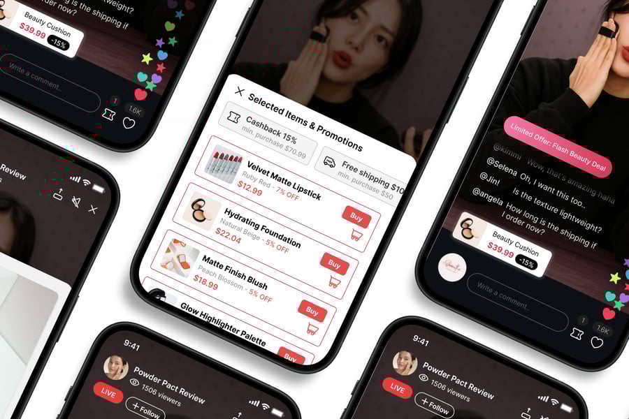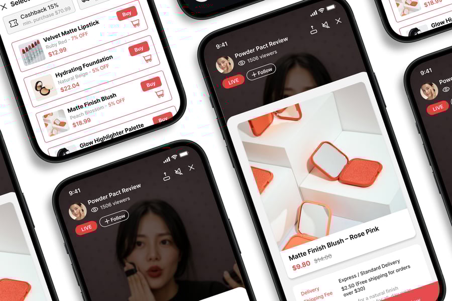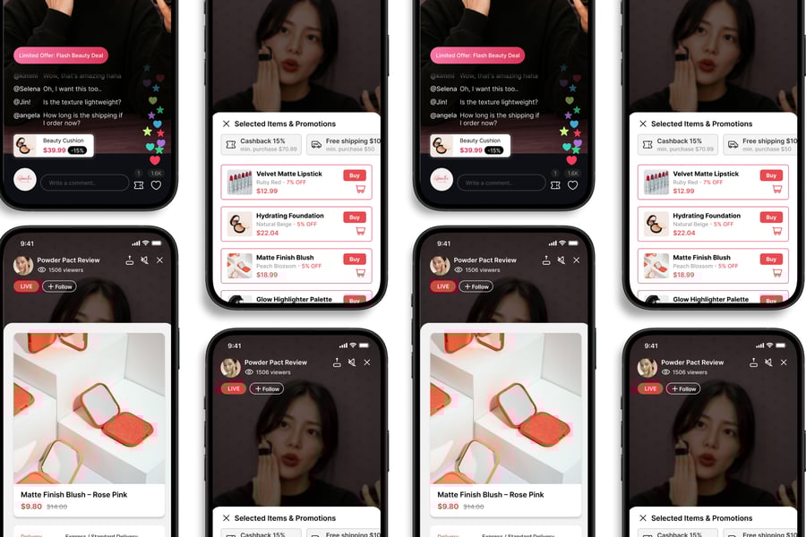 **Live Shopping** UI 套件的设计注重易用性和一致性,让您轻松创建美观实用的移动应用。每个元素都经过精心设计,完全可定制,并可根据您的品牌进行调整。无论您是设计社交应用、电商应用还是生产力工具,此套件都能让您灵活地将创意轻松转化为现实。
