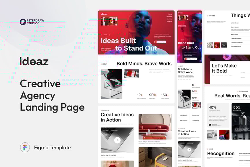 Ideaz 是一款专为具有前瞻性思维的创意机构打造的醒目着陆页模板,可助您展现大胆的创意和现代设计。它基于 Figma 构建,并针对桌面和移动端视图进行了优化,助力设计工作室、品牌咨询公司和营销公司自信地展示其愿景、作品集和服务。每个部分都力求体现原创性,并激发客户采取行动。