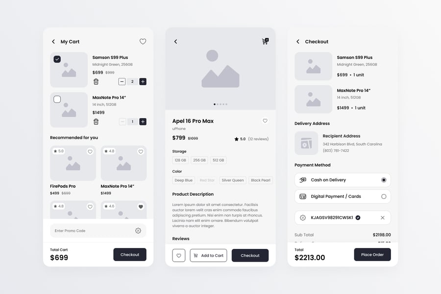 + 5 个以上核心屏幕:入门、主页、产品列表、购物车、结帐