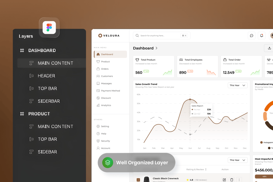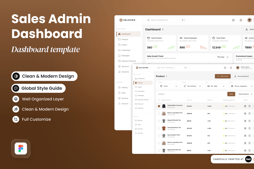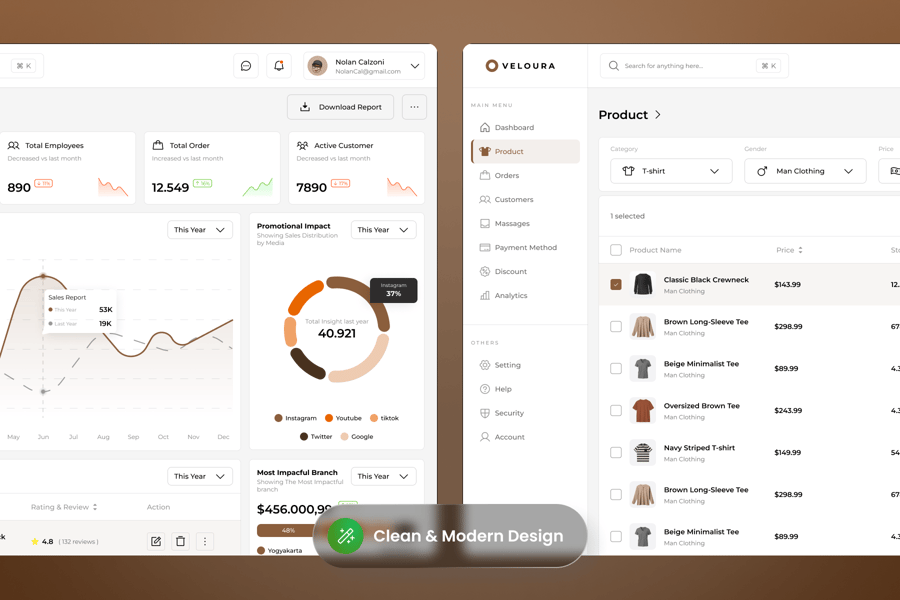 仪表盘提供简洁优雅的概览页面,用于管理您的时尚电商业务。自 2025 年 8 月起,Veloura 仪表盘采用极简主义美学和温暖朴实的配色方案。它拥有简洁的排版和都市中性风,通过直观的图表和表格,清晰地呈现关键指标、销售趋势、促销渠道表现和热门产品。Veloura 仪表盘支持跨设备响应,具有交互元素和高可用性,是增强您时尚电商运营的强大工具。