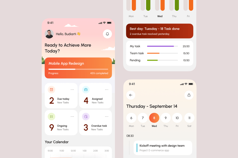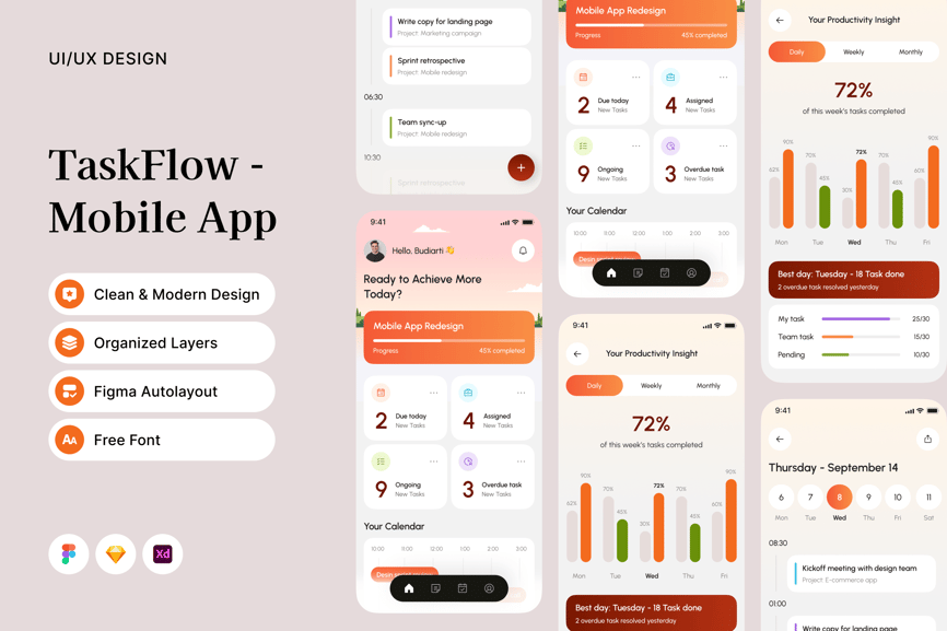 TaskFlow – 移动应用 UI 套件是一款现代专业的设计模板,专为构建生产力、任务管理和日程安排应用程序而设计。它布局简洁,流程直观,包含用于创建任务、管理项目、跟踪进度和查看生产力洞察的屏幕。