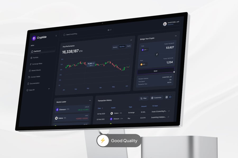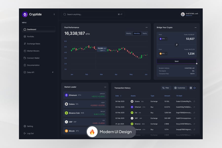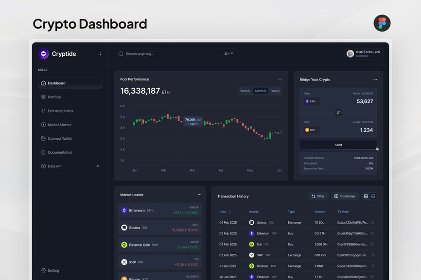 简洁流畅、数据驱动的加密货币仪表盘,旨在提升清晰度、控制力和信心。该 UI/UX 理念专注于实时性能跟踪、钱包管理和直观导航,使用户能够更轻松地监控资产、分析趋势,并在快速发展的加密货币世界中做出明智的决策。