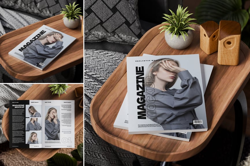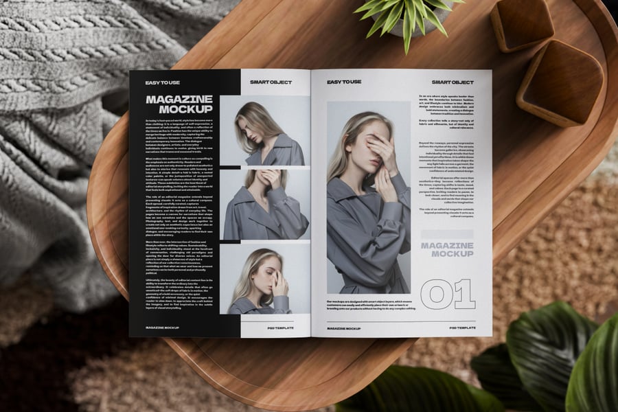 杂志书籍模型以逼真优雅的方式展现编辑版面、时尚杂志或创意出版物。模型放置在木桌上,周围环绕着自然环境,无论是封面还是内页,都能凸显杂志的设计。该模型以高分辨率呈现,包含分层 PSD 文件和智能对象,方便用户轻松定制封面、跨页和品牌细节。专业的灯光和真实的纹理,营造出精致时尚的视觉效果。