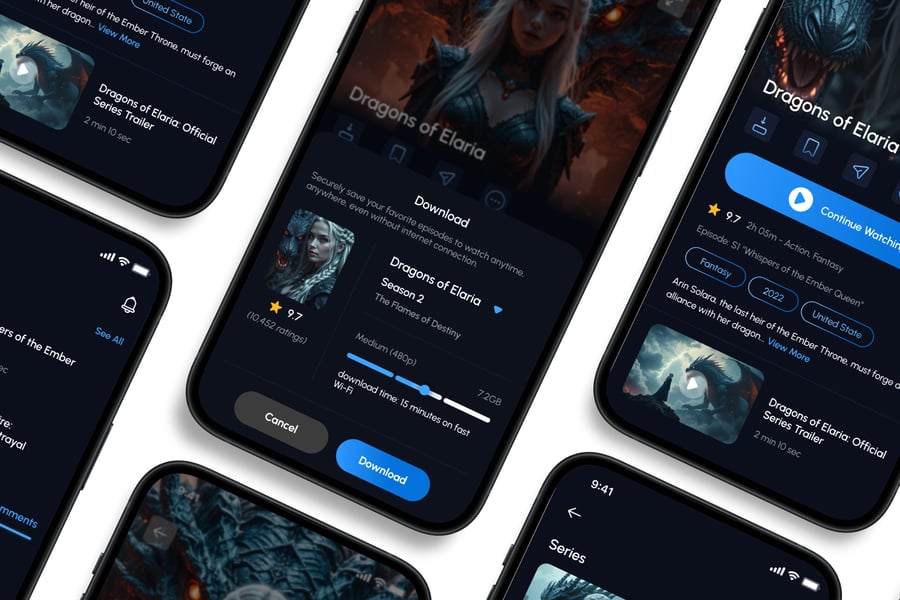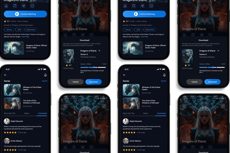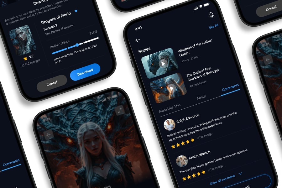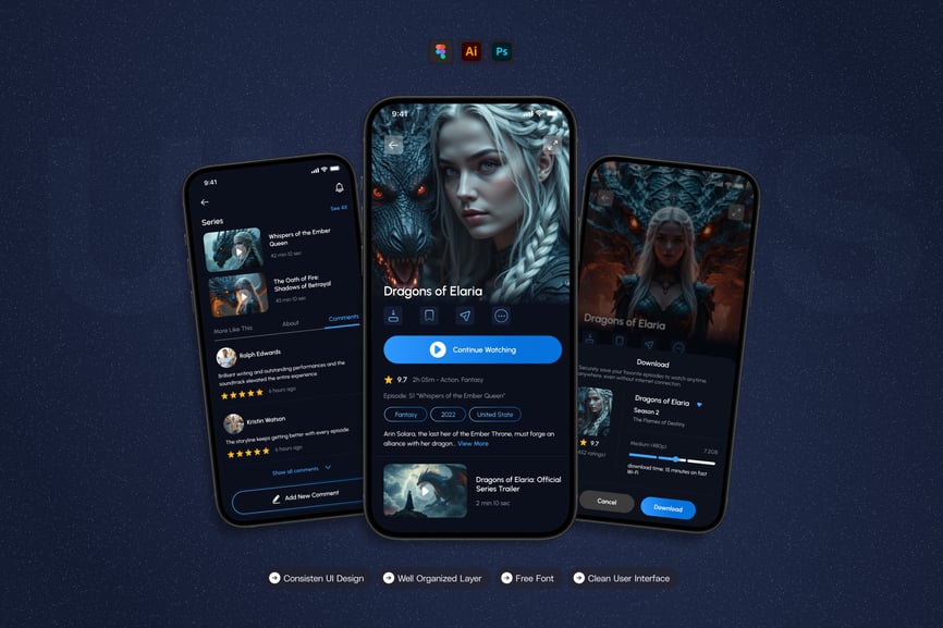 隆重推出**电影流媒体**移动应用 UI 套件,它是一款现代化且功能丰富的解决方案,可用于创建简洁、用户友好的应用界面。对于希望加快设计流程的设计师和开发者来说,这款 UI 套件完美契合,它在一个有序的软件包中提供了所需的所有基本组件。