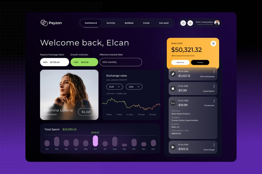 **Payzon** 是一款现代优雅的仪表板界面,专为数字钱包、新银行和个人理财应用而设计。这款单页仪表板基于 Figma 构建,提供极具冲击力的视觉体验,同时确保最终用户的清晰度和易用性。