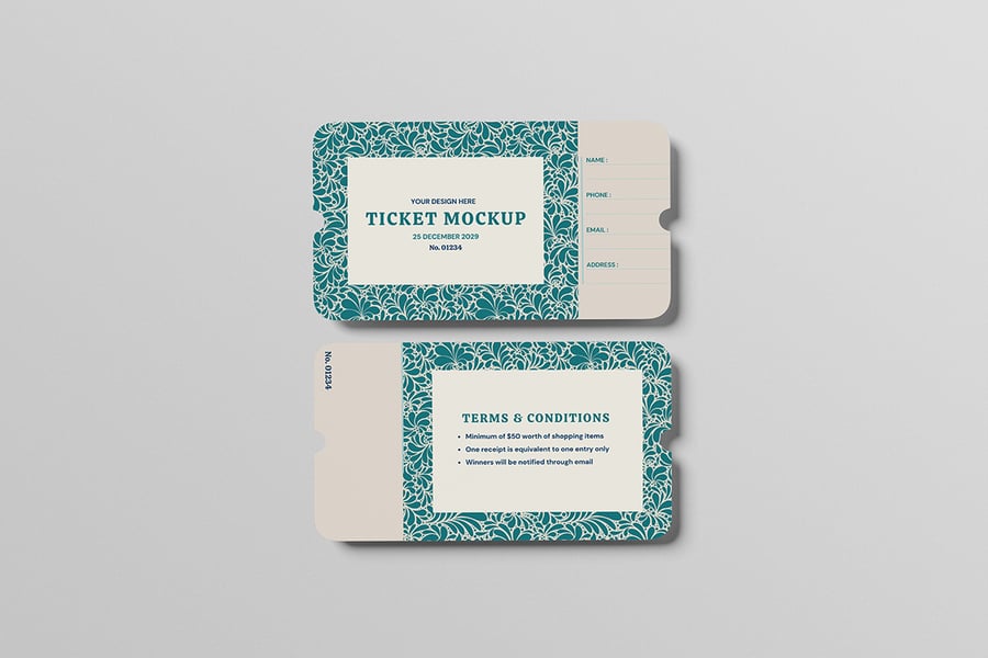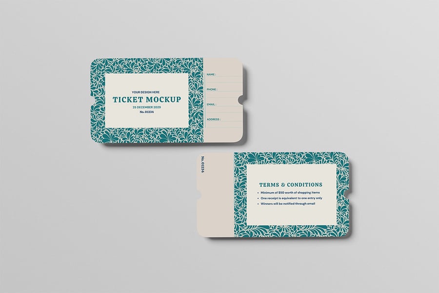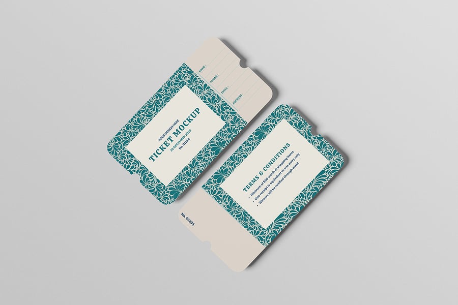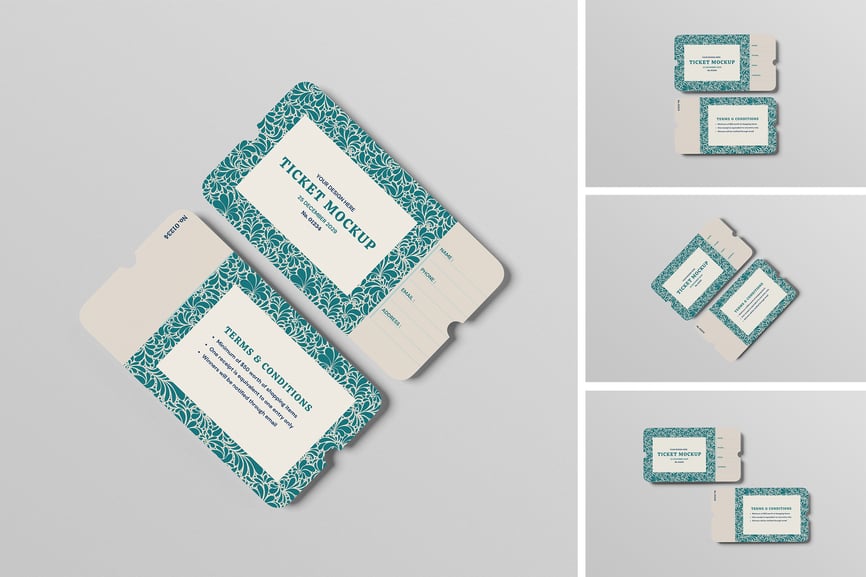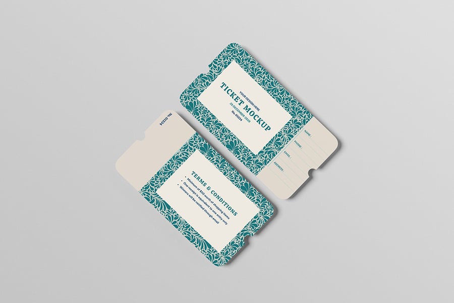 在这些风格华丽的库存模型上展示您的票务模型设计。此模型包含 3 个项目,并带有分层精美的 PSD 文件。此外,此模型还使用了智能对象功能,这意味着您只需几秒钟即可轻松快速地将当前设计更改为您自己的设计。