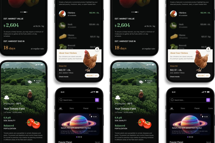 **农场管理** UI 套件的设计注重易用性和一致性,让您轻松创建美观实用的移动应用程序。每个元素都经过精心设计,完全可定制,并可根据您的品牌进行调整。无论您是设计社交应用、电商应用还是生产力工具,此套件都能让您灵活地将创意轻松转化为现实。
