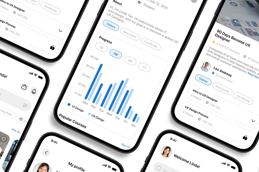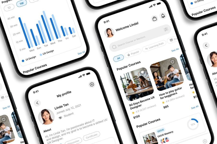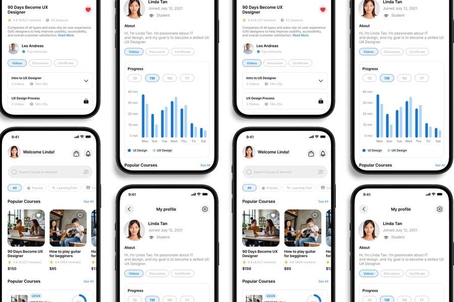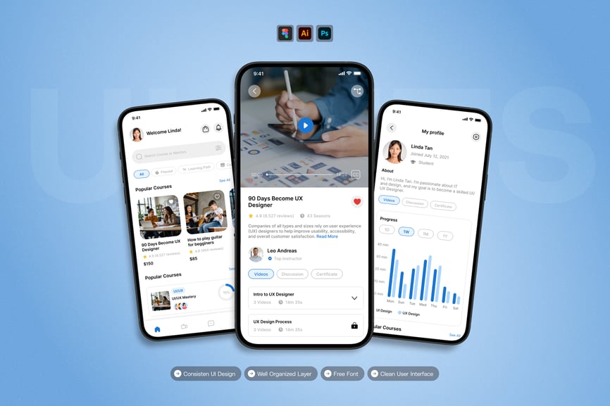 **E-Course** UI 套件的设计注重可用性和一致性,让您轻松创建美观实用的移动应用程序。每个元素都经过精心设计,完全可定制,并可根据您的品牌进行调整。无论您是设计社交应用、电商应用还是生产力工具,此套件都能让您灵活地将创意轻松转化为现实。
