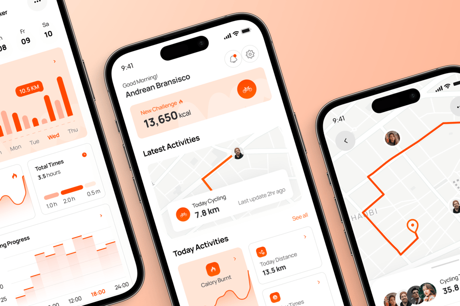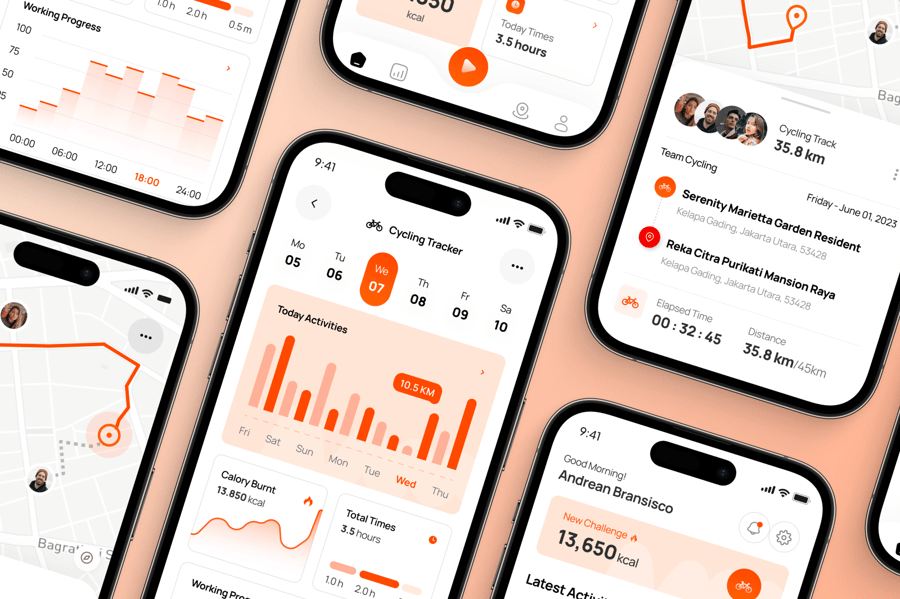 这是一款专为骑行者和健身爱好者打造的性能驱动型 UI 套件,将 GPS 路线与锻炼洞察相结合。它配备导航、速度监控和距离记录等屏幕,可提供精准的追踪。