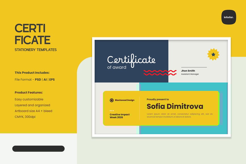 概述:简洁、现代、专业的证书模板。完全可定制,易于使用和替换颜色和文本,图像容器为智能对象,方便您添加图像和编辑文件。