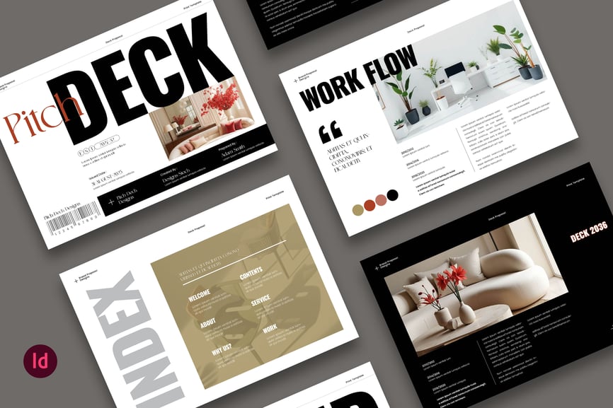 这款 Pitch-Deck 模板是一款高级设计的书籍版式,可在 Adobe Indesign 中使用。它包含现代优雅的布局,并带有精心设计的细节,例如自动页码、自动目录、文本页面和带标题的页面。它包含一些标题、副标题和正文的段落/字符样式。