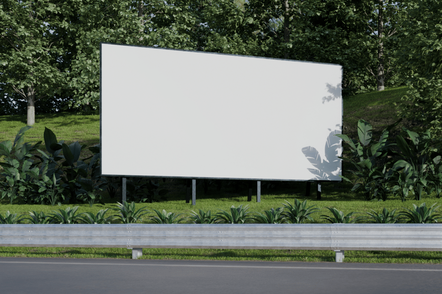 画面中,一块广告牌被树木和路边景物环绕,采用平视角度拍摄,以突出其清晰度和比例。广告牌表面呈现出真实的乙烯基纹理和光线漫射效果,重现了户外印刷材料的外观,同时避免了画面过度曝光。构图以广告牌为中心,周围环绕着精致的细节,在不分散注意力的前提下增强了真实感。