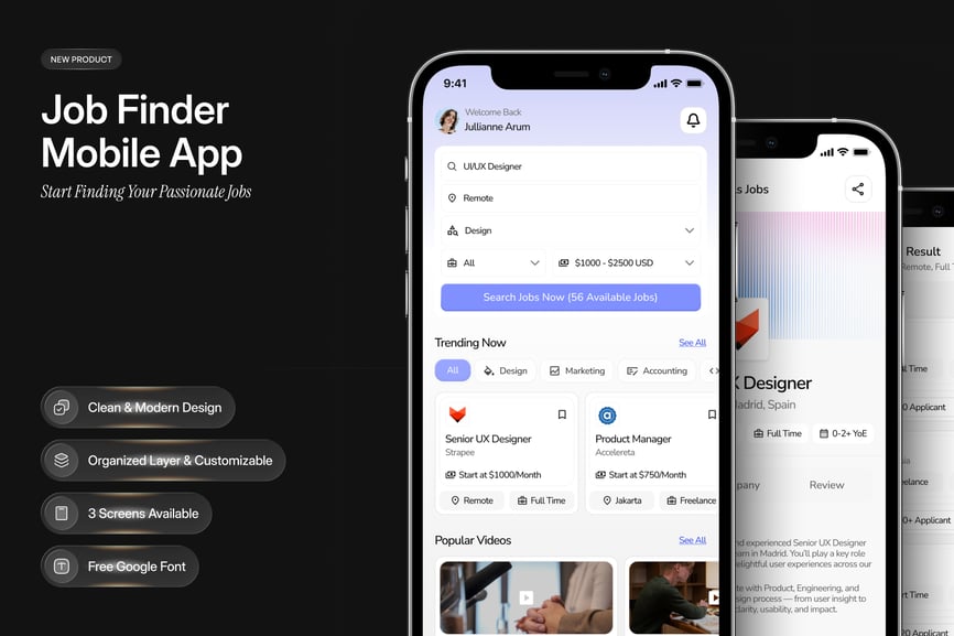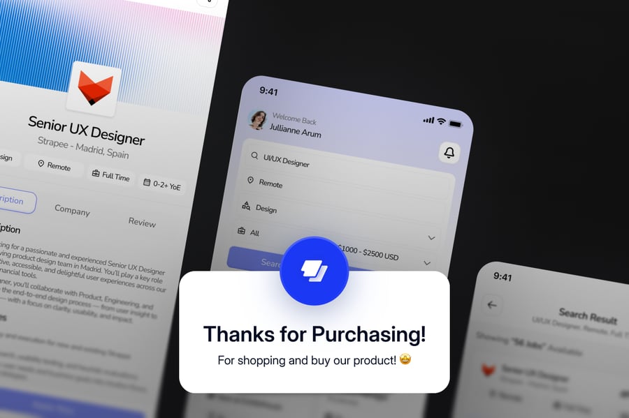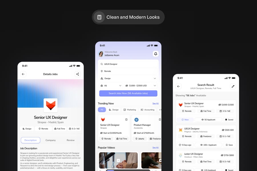 这款移动应用UI设计套件非常适合求职平台、职业门户网站和招聘应用。它拥有简洁现代的界面,用户可以流畅地搜索职位机会、查看详细列表并申请。尤其适用于连接专业人士与雇主、自由职业者和远程工作市场的应用。