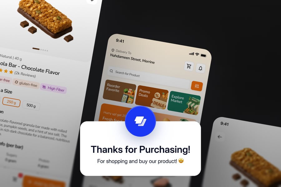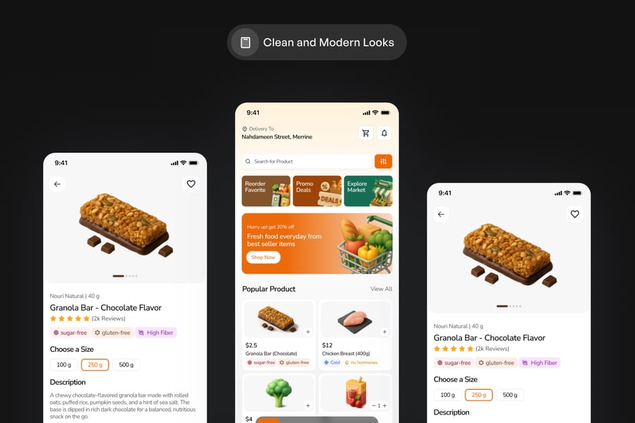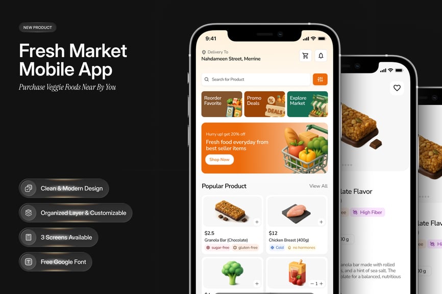 这款移动应用UI设计套件专为生鲜市场、生鲜配送和在线购物平台而设计。它拥有简洁现代的界面,方便用户浏览市场商品、查看详细的食品信息并轻松完成订单。非常适合专注于新鲜农产品、健康食品和便捷在线生鲜购物的应用。