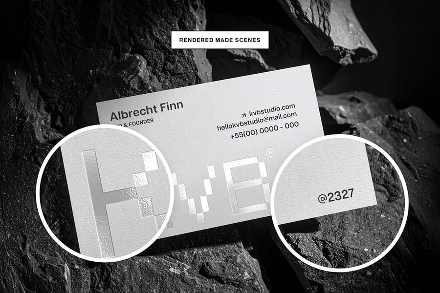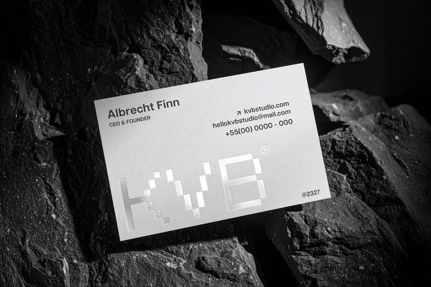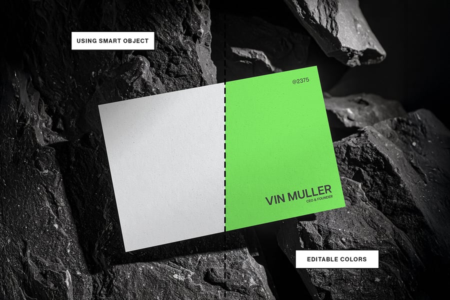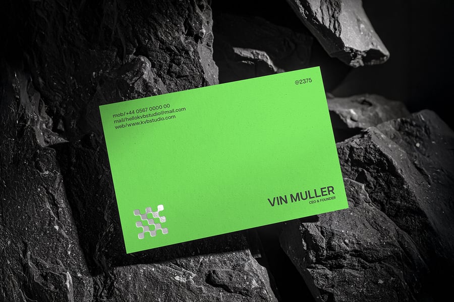 一款极简风格的压纹名片样机,展示于石质表面上。该样机拥有逼真的纹理和光照效果,呈现专业展示效果。您可以使用智能对象图层轻松自定义设计。非常适合用于展示品牌、标志或标识设计项目。
