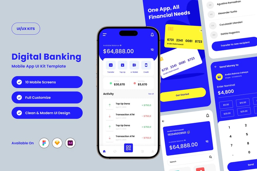 EzyPay 是一款高效的数字银行应用 UI 套件,它将现代简约的设计、流畅的导航和一流的安全性完美结合。其充满活力的渐变色调和清晰的无衬线字体,营造出值得信赖且富有创新性的界面,是金融科技解决方案和移动金融应用的理想之选。