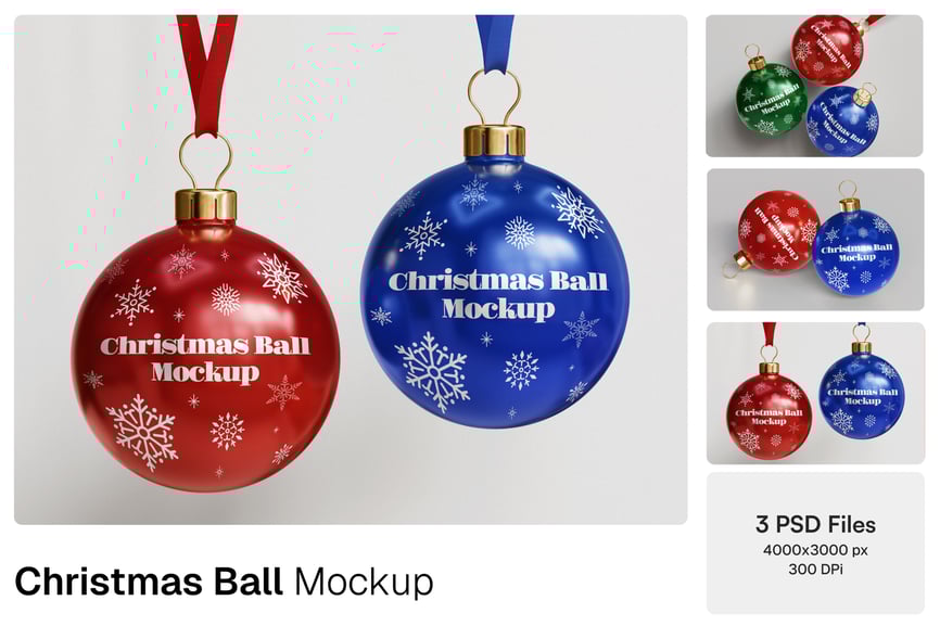 每个模型都包含逼真的圣诞球,有红色、蓝色和绿色三种颜色可选,并配有反光表面、金属帽和悬挂的丝带。非常适合用于节日品牌推广、包装设计、季节性产品广告或圣诞贺卡视觉效果。