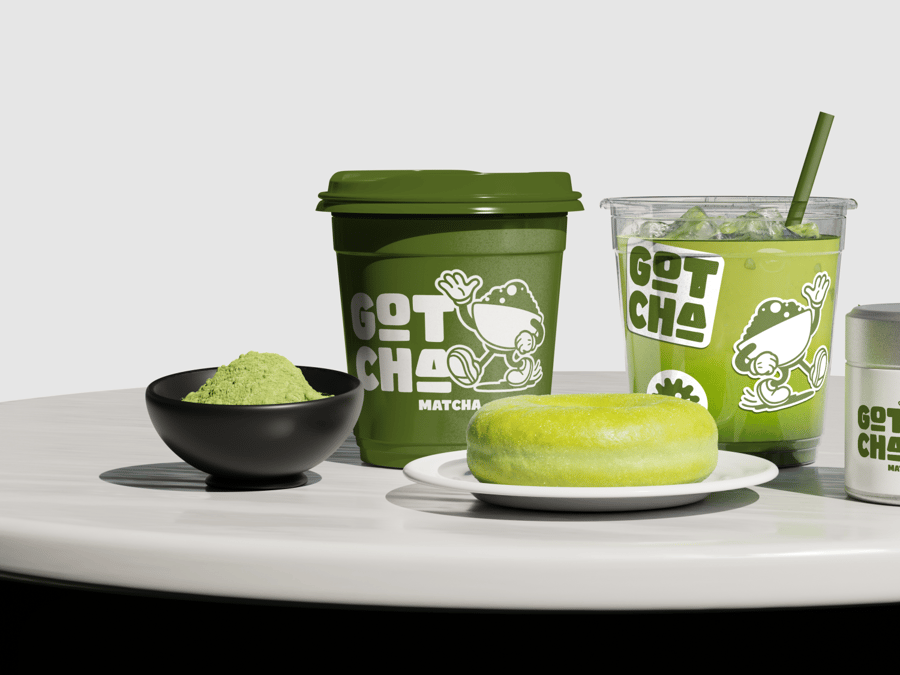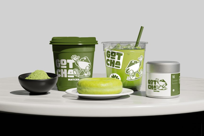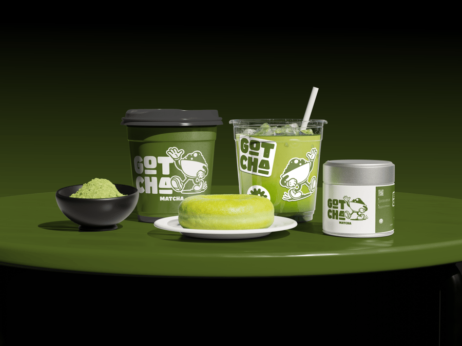 场景中包含热抹茶杯、冰抹茶杯、抹茶粉罐、抹茶甜甜圈和抹茶粉碗——这一场景非常适合以专业和引人入胜的方式展示现代咖啡品牌、饮料产品或特色抹茶系列。