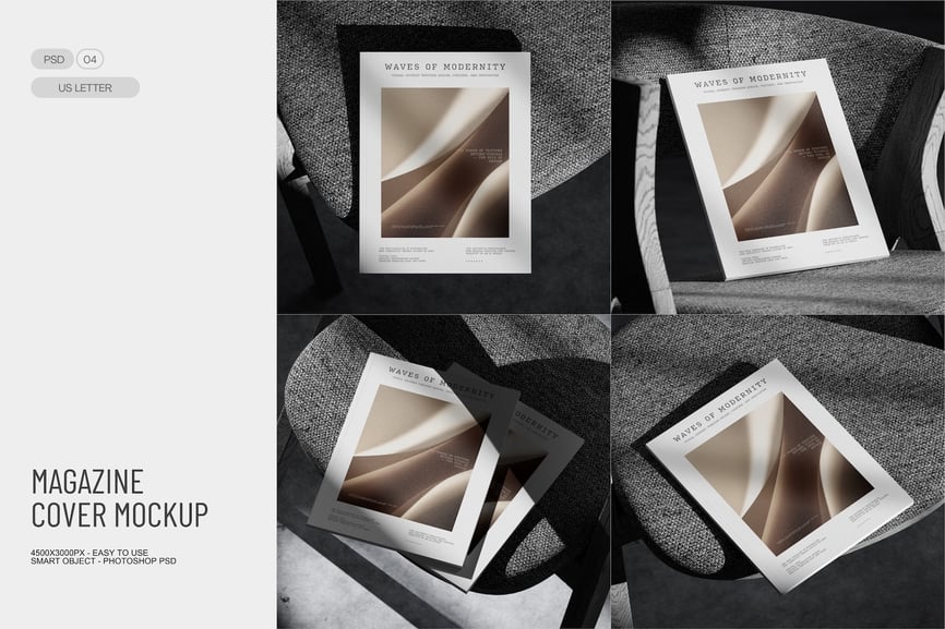 这款优质的美国信纸杂志封面样机,能以逼真而时尚的方式展示您的杂志设计。样机采用现代座椅搭配自然阴影效果,为任何演示增添深度和精致感,是设计师、创意人员和品牌专业人士的理想之选。