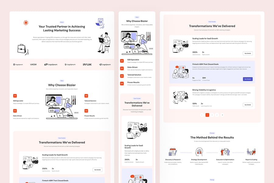 Bizzier 专为桌面和移动设备设计,可在所有设备上提供响应迅速、性能卓越的用户体验。每个布局细节都经过优化,确保用户体验流畅,从而保证您的营销信息既具有说服力又专业。