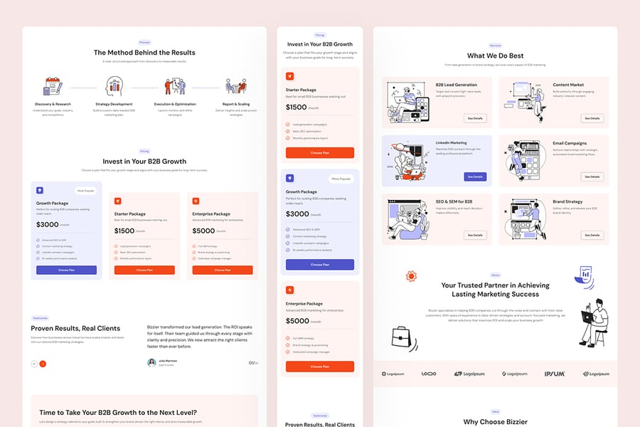从首页醒目的标题到定价和客户评价,Bizzier 的设计旨在引导访客采取行动。首页以引人入胜的标题、简洁明了的指标和强有力的行动号召 (CTA) 展示贵公司的优势,从访客首次浏览页面即可建立信任。服务板块,例如“我们的优势”和“我们实现的转型案例”,巧妙地结合视觉效果和数据,突出展示贵公司的专业知识和成功案例;而价格层级和联系表单等以转化为导向的板块,则确保访客能够轻松互动或咨询。