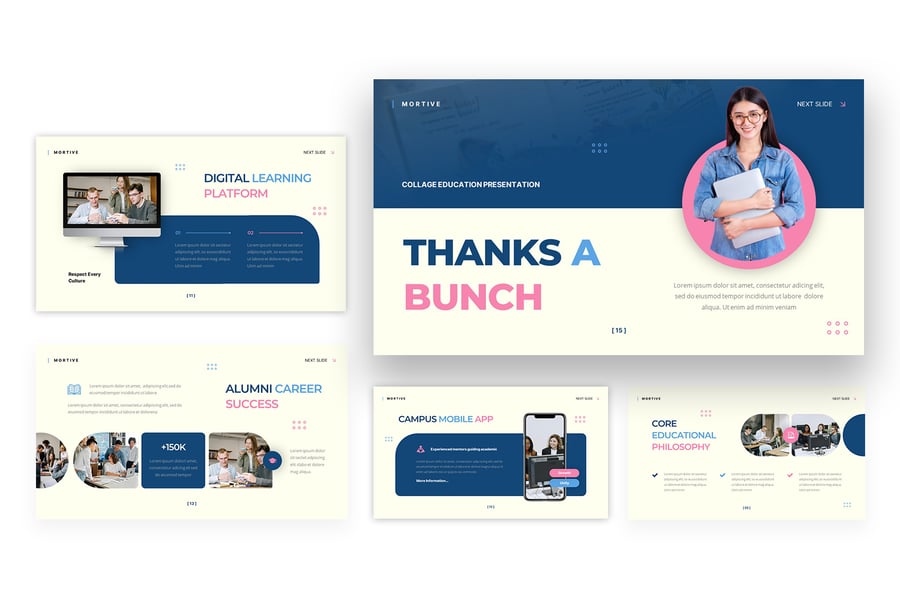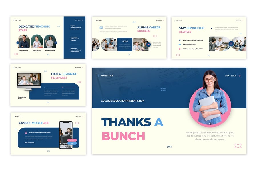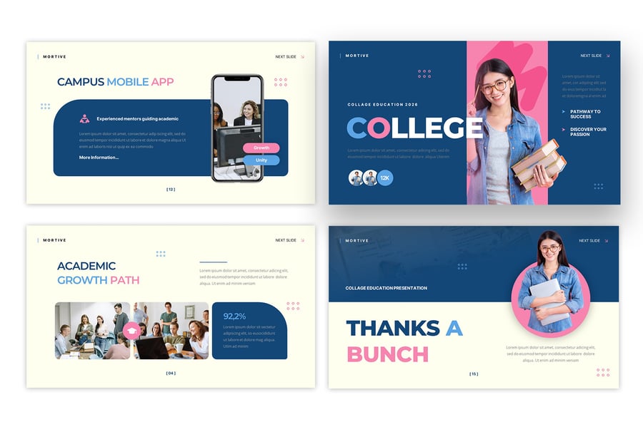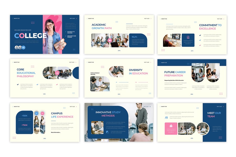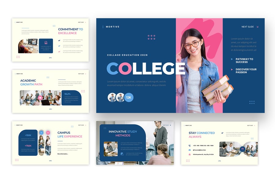 使用此大学教育演示模板清晰地传达学术信息。该模板采用现代专业的布局设计,非常适合展示校园简介、学术项目、招生详情、学生生活和院校成就。简洁的设计确保信息易于理解,同时保持了精美而引人入胜的风格。