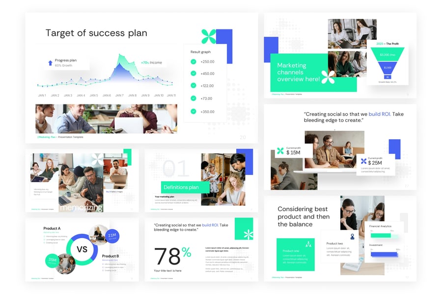 相关性和用例非常适合营销策略、业务增长计划、投资回报率演示、竞争对手分析、产品绩效报告、创业推介平台、投资者会议、代理提案、销售演示、项目规划、公司评估、团队会议、数字营销报告、季度更新、业务绩效跟踪。