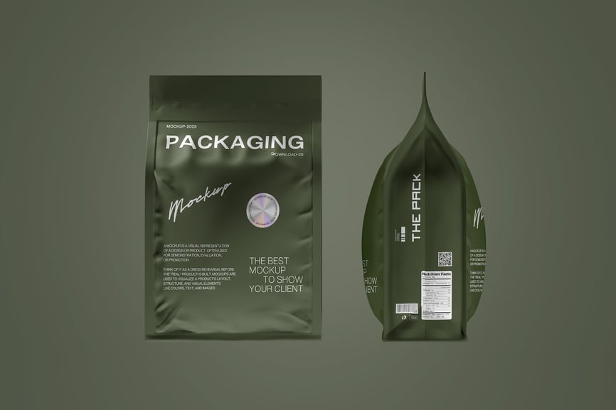 一套详细的模型图,展示了自立袋的正面和侧面视图,非常适合用于展示产品包装设计。此模板突出了品牌标识的位置、结构和布局,以实现清晰有效的可视化效果