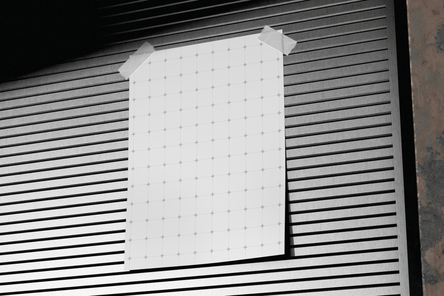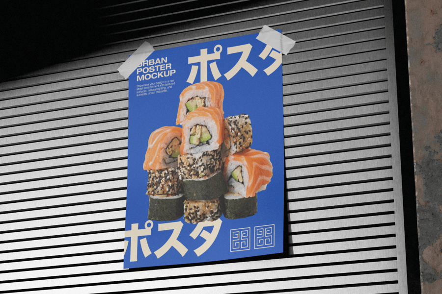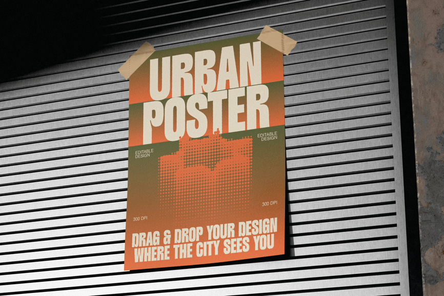 此文件质量一流,可提供高分辨率预览。背景是粗糙的工业墙面,营造出强烈的户外氛围。侧光照射下,清晰的阴影使海报显得非常真实,并略微凸显于背景之上。这幅单幅广告图采用正面拍摄角度,非常适合用于演示文稿、电商产品列表或需要突出画面内容的社交媒体帖子。