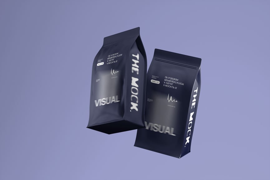 一套包含两个立式咖啡包装袋的模型,旨在展示品牌和包装理念。这种摆放方式清晰地突出了包装袋的正面和侧面,以实现有效的展示效果
