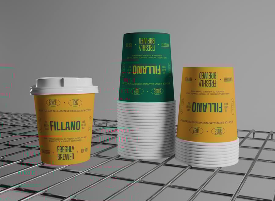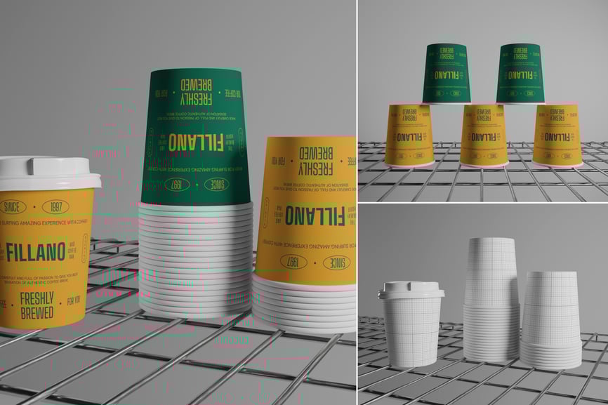 用这款**简洁的咖啡杯样机**展示您的咖啡馆品牌形象。三个**纸质外带杯**整齐地排列成一排,分别从**正面平视角度**和**侧面中角度**拍摄,背景是**简约的灰色墙面**和**金属丝架**。极简的摄影棚灯光和柔和的反射营造出清新专业的氛围,非常适合需要展现精致形象、随时准备上桌的咖啡店、烘焙店或外带包装。