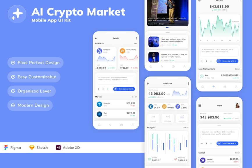 每个屏幕都可完全自定义,易于使用,并针对 Figma、Sketch 和 Adobe XD 进行了精心设计。