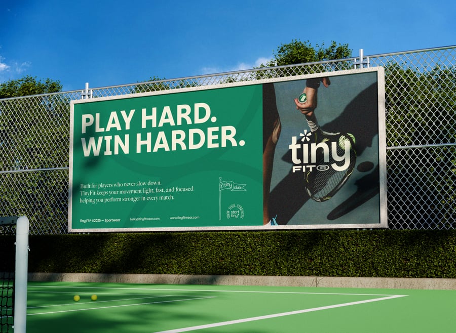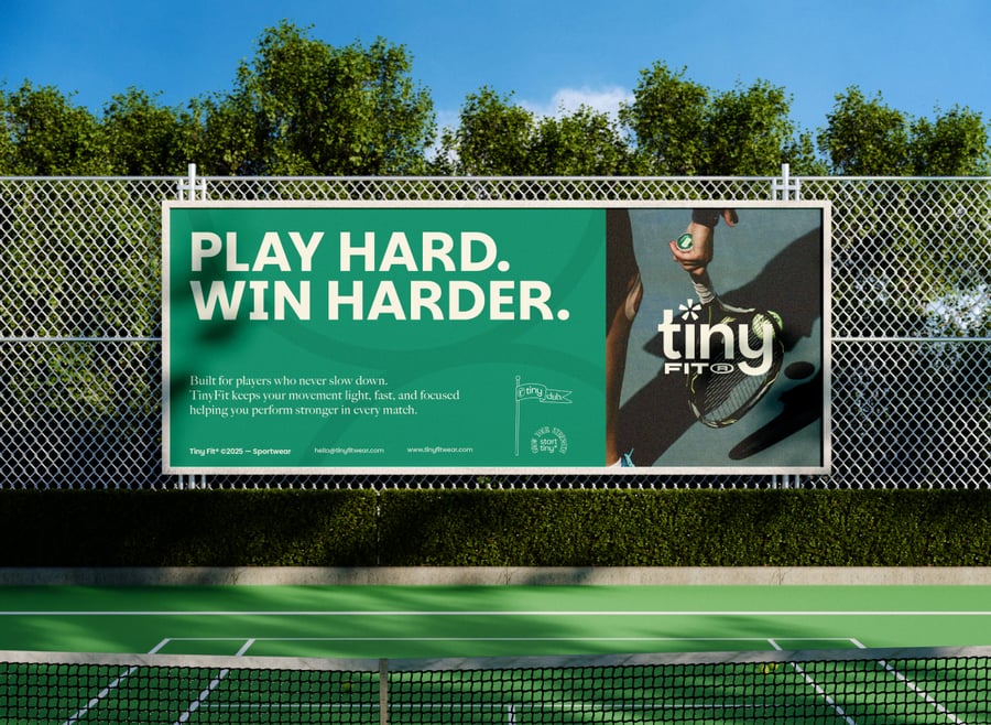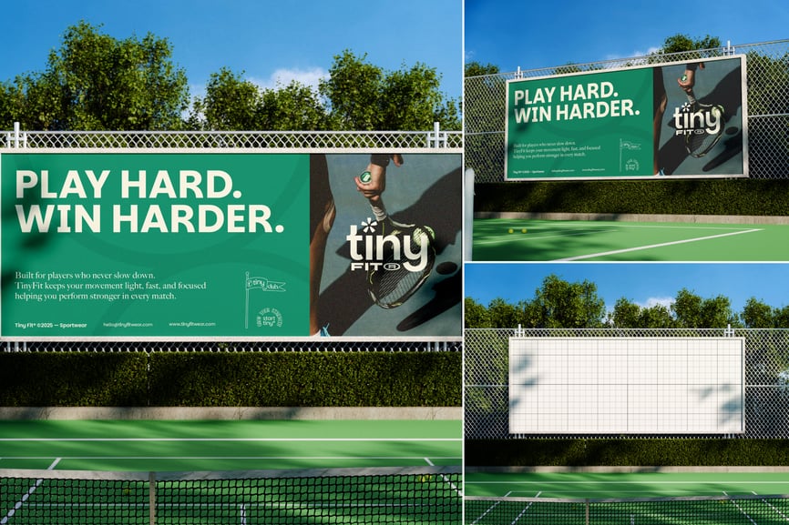使用这款**逼真的网球场广告牌模型**展示您的宣传活动。三幅**大型竖幅广告牌**醒目地矗立在**室外网球场**旁,从中等距离平视观看。场景包括透明球网、铁丝网围栏、环绕的树木和湛蓝的天空——营造出真实而充满活力的运动氛围,非常适合赛事赞助商、运动装备品牌或生活方式推广。
