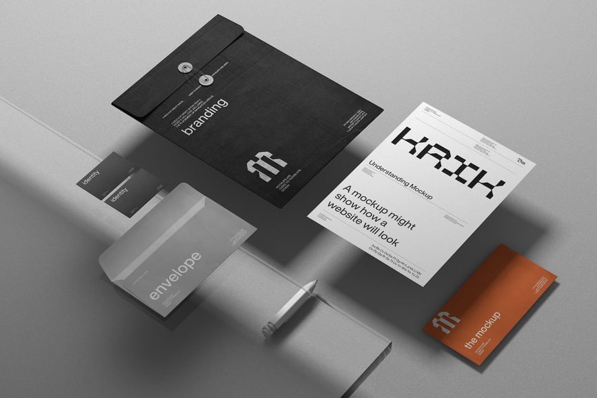 此模型包含一套完整的办公用品识别系统,包括信封、名片、信纸和文件夹,采用工作室布局。它适用于展示企业品牌系统和识别设计