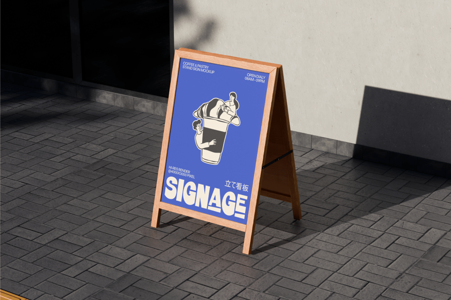 **高分辨率木质A字架店铺招牌模型**旨在清晰、逼真地展示户外广告,并营造强烈的街头视觉冲击力。该模型展示了一个放置在城市人行道上的A字架招牌,呈现出逼真的街头效果,完美模拟了真实的零售和咖啡馆环境。